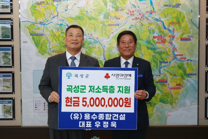 [뉴스다컴] 전남 곡성군은 지난 17일 여수시 화장동에 소재한 (유)용수종합건설(대표 우정욱)에서 곡성군 노인맞춤돌봄서비스 이용 어르신을 지원하기 위해 현금 500만 원을 기탁했다고 18일 밝혔다.