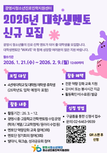 [뉴스다컴] 광명시청소년재단 청소년진로진학지원센터는 관내 중·고등학교 청소년 대상 학과 멘토링 운영을 위해 ‘2026년 대학생 멘토단(wave)’을 모집한다고 밝혔다.