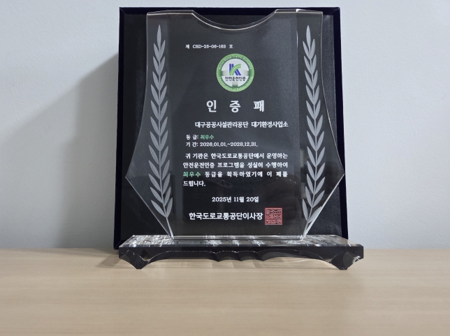 [뉴스다컴] 대구공공시설관리공단(이사장 문기봉) 대기환경사업소는 지난 20일 한국도로교통공단에서 시행된 ‘안전운전인증’ 심의 결과, 11월 26일 최우수 등급으로 인정받았다.