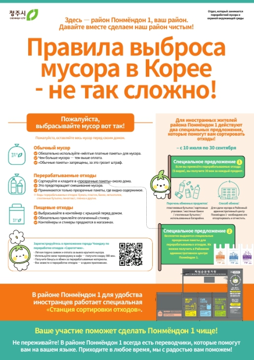 시는 오는 9월 30일까지 약 3개월간 운영하며 △외국인 밀집지역 내 자원순환정거장 설치 △재활용 투명봉투 무상 배부 △재활용품 교환 인센티브 상향 지급 △봉명초등학교와 연계한 어린이 대상 자원순환 교육 △외국인 상가지역 전수조사(상가지도 제작) △러시아어 분리배출 홍보물 제작・배포 등을 추진한다.