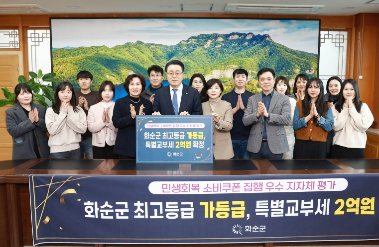 [뉴스다컴] 화순군은 24일 행정안전부가 주관한 ‘민생회복 소비쿠폰 집행 우수 지자체 평가’에서 최우수 지자체로 선정돼 특별교부세 2억 원을 확보했다고 밝혔다.