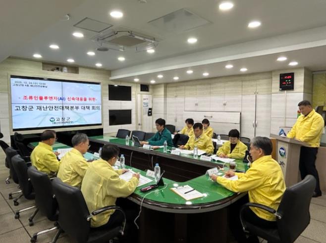 [뉴스다컴] 고창군이 24일 김영식 부군수주재로 군청 재난안전상황실에서 행정안전부와 함께 재난안전대책본부 회의를 열고, 고병원성 조류인플루엔자(AI) 확산 방지를 위한 방역관리 상황을 점검했다.