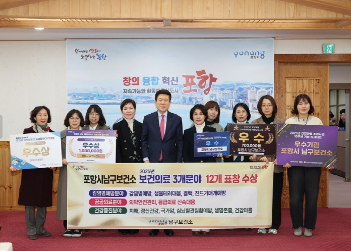 [뉴스다컴] 포항시 남구보건소가 2025년 한 해 동안 보건의료 전 분야에서 탁월한 성과를 거두며, 중앙부처와 경상북도 평가 등에서 총 3개 분야 12개의 상을 휩쓸었다고 23일 밝혔다.