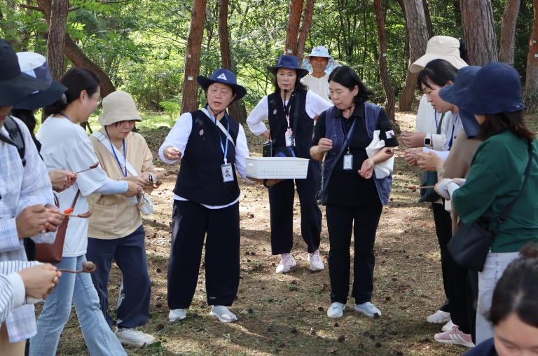 교육은 내포 사색길 입구에서 가벼운 체조로 몸과 마음을 열며 시작됐다. 이어 참가자들은 코스를 나누어 소그룹 활동을 진행하며 숲 속 식물과 자연물에 대해 배우고, 이를 활용한 다양한 오감 놀이 방법을 탐색했다.