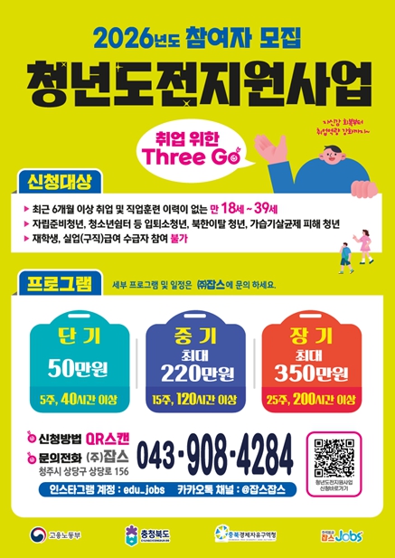 [뉴스다컴] 충북경제자유구역청은 구직 의욕이 낮아진 도내 청년들의 원활한 사회 진출을 돕기 위해 고용노동부가 주관하는 ‘2026년 청년도전 지원사업’의 국비 11억 6,000만 원을 확보하고 본격적인 참여자 모집에 나선다고 밝혔다.