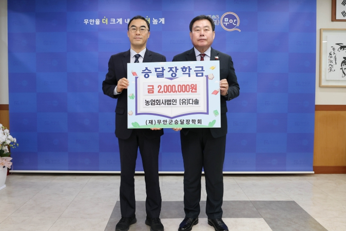 [뉴스다컴] 무안군은 지난 9일 농업회사법인 유한회사 다솔 김지수 대표가 지역 인재 육성을 위해 (재)무안군승달장학회에 장학금 200만 원을 기탁했다고 밝혔다.