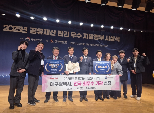 [뉴스다컴] 대구광역시는 12월 22일 행정안전부 주최 ‘2025년 공유재산 우수 지방자치단체 시상식’에서 공유재산 총조사 부문 최우수 기관 선정과 더불어, 공유재산 우수사례 경진대회에서 우수상(장관상)을 수상하는 등 공유재산 관리와 활용 분야에서 최고 수준의 역량을 입증했다.