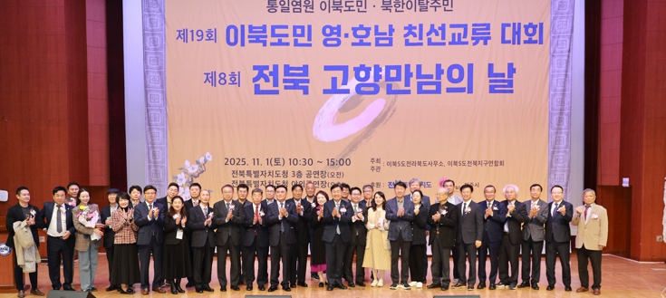 [뉴스다컴] 전북특별자치도와 이북5도전북특별자치도사무소는 11월 1일 전북특별자치도청 공연장에서 ‘제8회 통일염원 이북도민․북한이탈주민 전북 고향만남의 날’ 및 ‘제19회 영호남 친선교류대회’ 행사를 개최했다고 밝혔다.