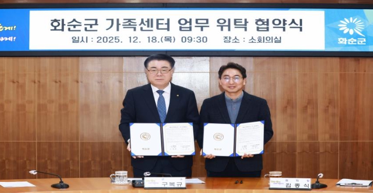 [뉴스다컴] 화순군은 18일 화순군청 소회의실에서 (사)다사랑건강가정복지협회(회장 김종식)와 화순군 가족센터 업무 위탁 협약을 체결하고, 가족 지원 정책의 안정적 추진과 지역사회 돌봄 기반 확충에 나섰다고 밝혔다.