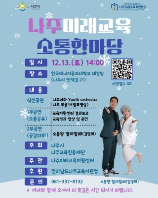 행사는 포스터 내 QR코드를 통한 사전 신청으로 참여할 수 있으며 자세한 사항은 나주미래교육지원센터로 문의하면 된다.