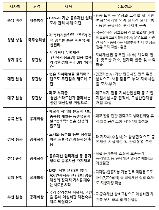 | ▲ 「2025년 공유재산 우수사례」선정 현황 (10건) |