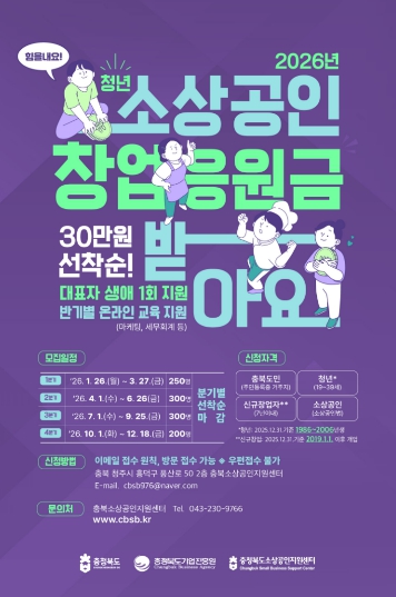 [뉴스다컴] 충북도와 (재)충청북도기업진흥원(소상공인지원센터)이 ‘2026년 청년 소상공인 창업응원금 지원사업’의 1분기 참여자 250명을 1월 26일부터 오는 3월 27일까지 선착순으로 모집한다.