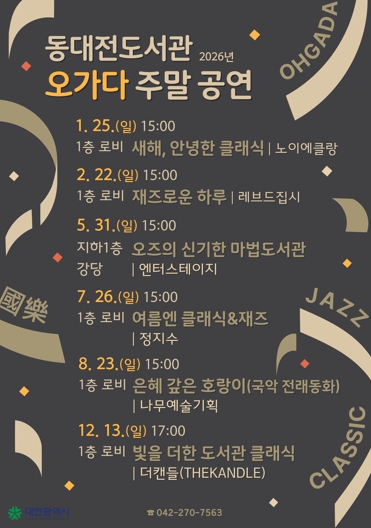 [뉴스다컴] 대전 동대전도서관은 25일 ‘새해, 안녕한 클래식’을 시작으로 2026년 ‘오가다 주말 공연’의 포문을 연다.