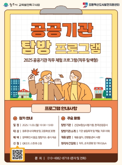 [뉴스다컴] (재)강원혁신도시발전지원센터는 원주시 교육발전특구 사업의 일환으로, 오는 11월 3일 원주권 내 청년들의 공공기관 진로 탐색 지원하기 위한 ‘2025 공공기관 직무 체험 프로그램(직무 탐색형)_공공기관 탐방’을 운영한다.