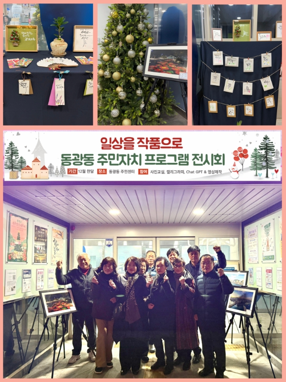 이번 전시는 2025년 동광동 주민자치 프로그램인 Chat GPT · 영상제작교실, 사진교실, 캘리그라피 교실 수강생들의 빛나는 작품들로풍성하게 구성됐다.