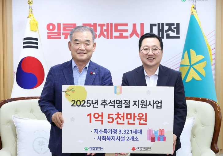 [뉴스다컴] 대전시는 9월 22일 시청에서 대전사회복지공동모금회로부터 추석 명절을 맞아 저소득가정을 돕기 위한 성금 1억 5천만 원을 기탁받았다. 이날 행사에는 유재욱 대전사회복지공동모금회 회장이 참석해 이장우 대전시장에게 성금을 전달했다. 시는 기탁금 중 1억3,500만 원을 저소득 3,321가구에 현금으로 지원하고, 나머지 1,500만 원은 쪽방상담소와 이주외국인종합복지관의 명절맞이 행사에 사용할 계획이다.