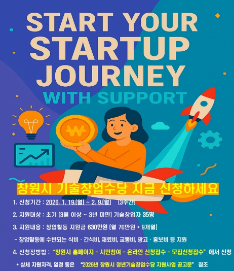 [뉴스다컴] 창원특례시는 1월 19일부터 2월 9일까지 ‘2026년 청년기술창업수당 지원사업’ 참여자 35명을 모집한다고 밝혔다.