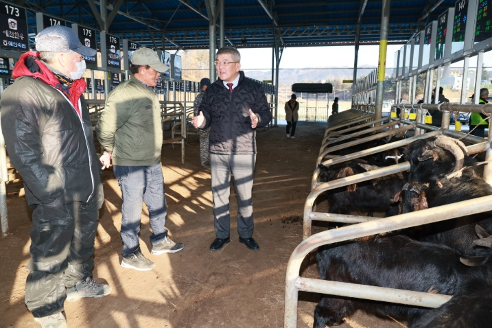 이날 현장에서 김학동 군수는 염소의 발육 상태와 경매 진행 과정을 꼼꼼히 살피며 “공정하고 원활한 거래가 이루어질 수 있도록 앞으로도 힘써달라”고 현장 관계자들에게 당부했고, “제도 변화로 어려움을 겪는 축산농가에 실질적인 대안이 될 수 있도록 육성 대책을 적극 추진하겠다”고 말했다.