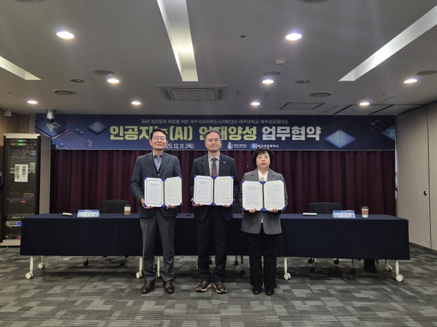 [뉴스다컴] 제주국제자유도시개발센터는 12월 11일 제주대학교, 제주상공회의소와 함께 도내 인공지능(AI) 전문인재 양성을 위한 업무협약을 체결했다.