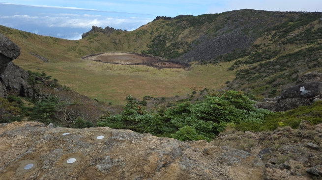 ▲ 백록담 남쪽 내벽에 설치된 추적표식판 전경 |