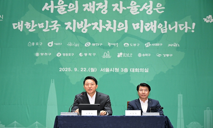 [뉴스다컴] 서울시와 구청장협의회는 22일 오전 8시 30분 서울시청 대회의실에서 소비쿠폰 등 정책 비용에 대한 정부의 일방적인 지자체 전가와 서울시에 대한 차등적 국비 보조 관행 개선을 촉구하는 내용의 ‘서울시‧자치구 지방재정 공동선언’을 발표했다.