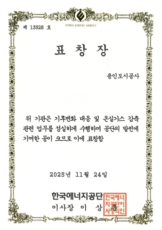 신경철 용인도시공사 사장은“이번 표창은 전 임직원이 함께 노력한 결과이며, 앞으로도 지역사회와 함께 기후위기 대응에 앞장서겠다”라며“지속가능한 도시를 만들기 위해 친환경 경영을 더욱 강화해 나갈 것”이라고 전했다.