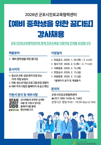 [뉴스다컴] (재)군포시청소년재단 군포시진로교육협력센터는 관내 예비중학생의 학교 적응과 진로 기초 역량 강화를 위해 '2026년 군포시진로교육협력센터 예비중학생을 위한 꿈디딤' 프로그램에 참여할 강사를 채용한다고 밝혔다.