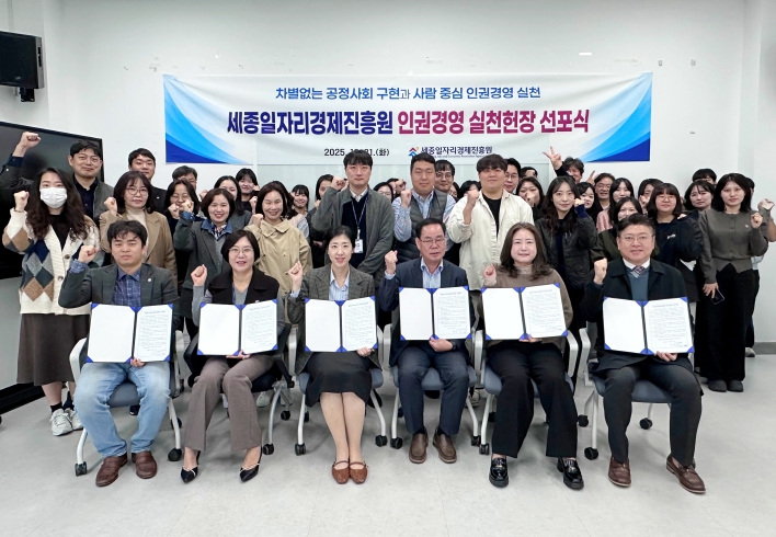 [뉴스다컴] 세종일자리경제진흥원(원장 이홍준)은 21일 본원 2층 교육실에서 ‘인권경영 실천헌장 선포식’을 열고 모든 임직원이 인권을 경영의 핵심 가치로 삼아 실천해 나갈 것을 다짐했다.