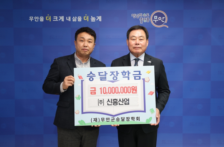 [뉴스다컴] 전남 무안군은 지난 1일 지역인재 육성을 위해 ㈜신흥산업이 장학금 1천만 원을, 청솔수산 윤낙진 대표가 장학금 1백만 원을 각각 (재)무안군승달장학회에 기탁했다고 밝혔다.