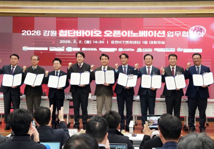 [뉴스다컴] 홍천군은 2월 2일, 강원특별자치도, 춘천시와 함께 춘천 ICT벤처 센터에서 「강원 첨단 바이오 오픈 이노베이션 프로그램」 업무협약식과 사업설명회를 개최하고, 올해부터 사업을 본격 확대 추진한다고 밝혔다.