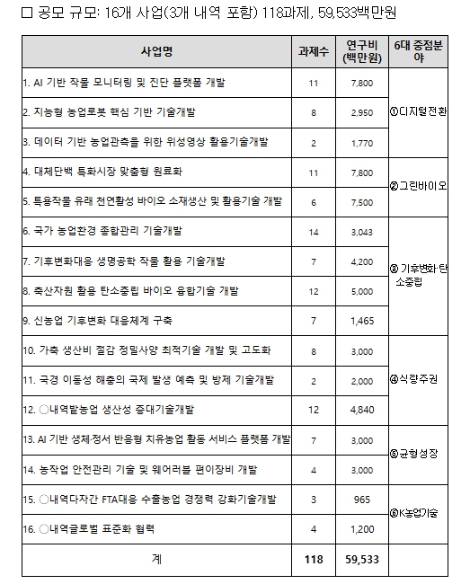 6대 분야는 다음과 같다. △미래 스마트농업 확산: 인공지능(AI) 기반 작물 모니터링 및 진단 플랫폼 개발, 위성영상 활용 기술 등(21과제, 약 125억 원) △바이오 및 푸드테크 산업 육성: 대체단백 특화시장 맞춤형 원료화, 특용작물 유래 바이오 소재 생산 등(17과제, 약 153억 원) △기후변화 및 탄소중립 대응: 축산자원 활용 탄소중립 기술, 신농업 기후변화 대응체계 구축 등 (40과제, 약 137억 원) △식량주권 확보: 밭농업 생산성 증대 기술, 가축 생산비 절감 정밀 사양 최적 기술 등 (22과제, 약 98억 원) △지역 균형성장 및 안전·행복한 농촌: 치유농업 활동 서비스 플랫폼 개발, 농작업 안전관리 및 웨어러블 장비 개발 등(11과제, 약 60억 원) △ 케이(K) 농업 국제적(글로벌) 확산: 다자간 자유무역협정(FTA) 대응 수출농업 경쟁력 강화 기술, 국제 표준화 협력 등(7과제, 약 22억 원)