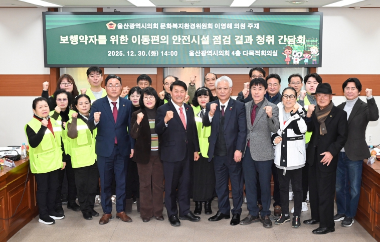 [뉴스다컴] 울산광역시의회 문화복지환경위원회 이영해 의원은 30일 오후 2시 4층 다목적회의실에서 '보행약자를 위한 이동편의 안전시설 점검 결과 청취 간담회'를 개최하고, 보행약자의 안전한 이동환경 조성을 위한 개선방안을 논의했다.