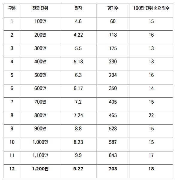 올 시즌 KBO 리그는 100만명 단위 관중 달성을 모두 역대 최소 경기로 달성한 바 있다. 또한, 지난 8월 23일 2시즌 연속 1,000만 관중 달성, 9월 5일 역대 한 시즌 최다 관중 신기록 달성, 9월 9일 역대 최초1,100만 관중 달성에 이어 1,200만 관중을 달성하며 또 한번 새로운 기록을 작성하게 됐다.