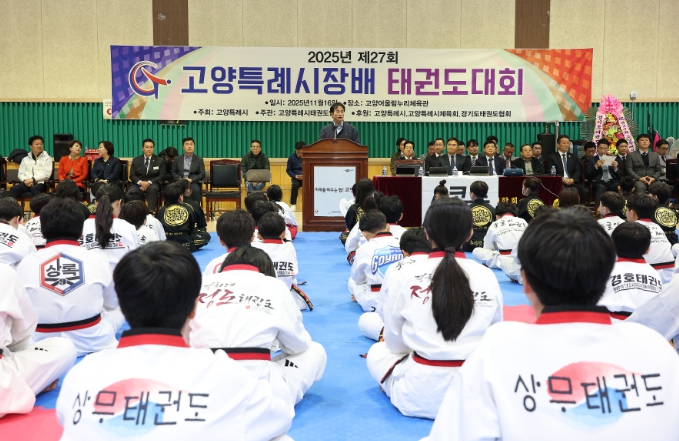[뉴스다컴] 2025년 제27회 고양특례시장기 태권도대회가 16일 고양어울림누리 체육관에서 개최됐다. 이동환 고양특례시장은 “갈고닦은 실력과 기량을 유감없이 발휘해 후회 없는 경기를 펼쳐주길”이라고 말했다.