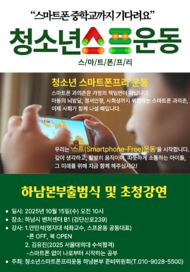 [뉴스다컴] 15일 오전 10시, 하남시 벤처센터에서 ‘청소년 스마트폰 프리 운동(Smartphone-Free)’ 하남본부 출범식을 갖는다.