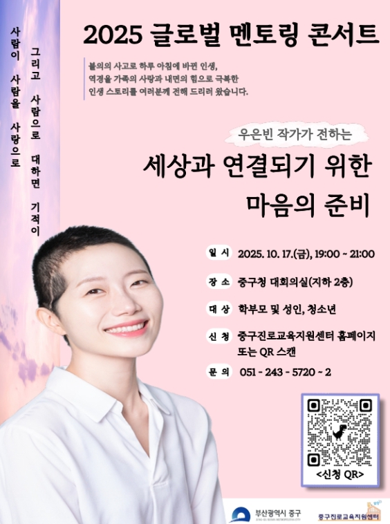 [뉴스다컴] 부산 중구는 중구 진로교육지원센터 주관으로 오는 10월 17일 오후 7시, 중구청 지하2층 대회의실에서 '2025 글로벌 멘토링 콘서트'를 개최한다.