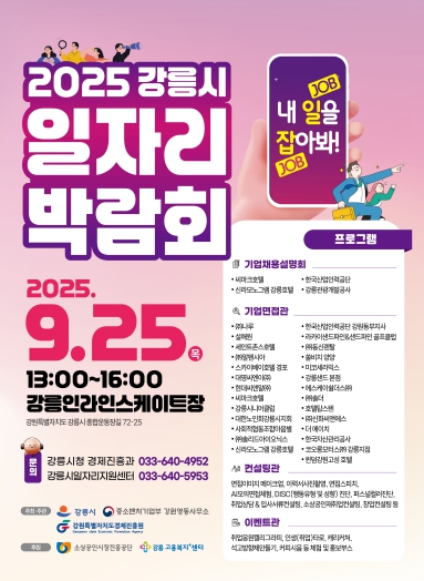 [뉴스다컴] 강릉시는 중소벤처기업부 강원영동사무소, 강원특별자치도경제진흥원과 함께하는 '2025 강릉시 일자리 박람회'를 오는 9월 25일 오후 1시부터 4시까지 강릉인라인스케이트장에서 개최한다.