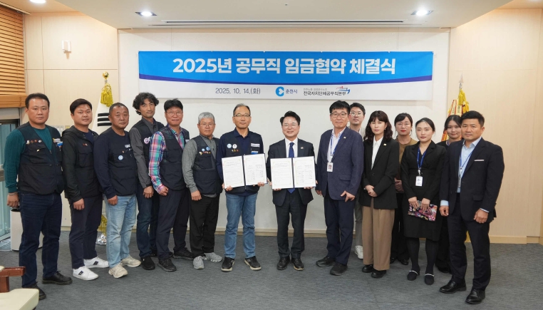 육동한 시장은 14일 시청 접견실에서 전국자치단체공무직본부 춘천시지부(지부장 박훈주)와 2025년 임금협약을 체결했다.