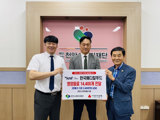[뉴스다컴] (재)천안시복지재단(이사장 이운형)은 9일 ㈜한국메디칼푸드(대표 장동한)가 취약계층 어르신을 위해 2,400만 원 상당의 영양음료 1만 4,400개를 기탁했다고 밝혔다.