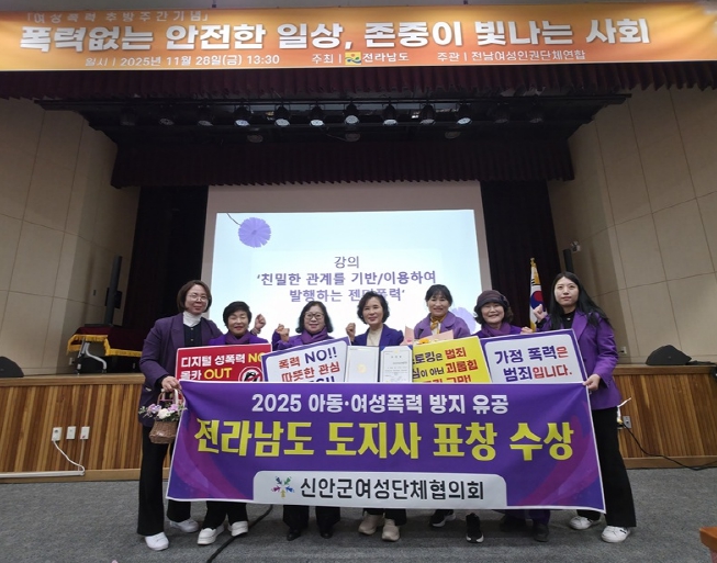 [뉴스다컴] 신안군여성단체협의회(회장 안미영)가 11월 28일 전남여성가족재단에서 개최된 ‘2025년 여성폭력추방주간 기념행사’에서 여성폭력 방지 유공을 인정받아 전남도지사 표창을 수상하는 영예를 안았다.