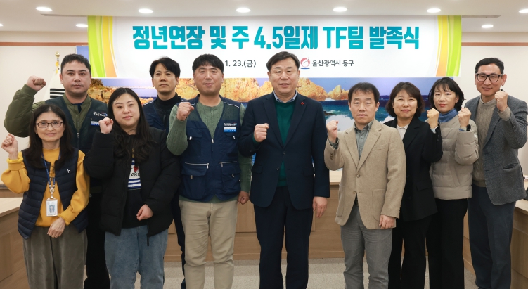 [뉴스다컴] 울산 동구는 1월 23일 오후 4시 동구청 상황실에서 구청장을 비롯해 자치단체공무직본부 동구지회장, 조합원 등 기관 및 노조 관계자 10명이 참석한 가운데 ‘정년연장 및 주 4.5일제 논의를 위한 TF팀 발족식’을 개최했다.