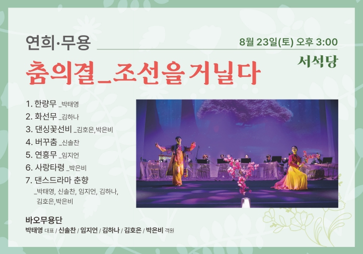 [뉴스다컴] 광주문화재단(대표이사 노희용) 전통문화관은 오는 8월 23일 오후 3시, 토요 상설공연 15회차 무대를 선보인다. 이번 공연 '춤의 결, 조선을 거닐다'는 조선 시대의 춤을 탐구·계승하는 동시에 현대적으로 재해석하여, 한국무용의 새로운 가능성을 모색하고자 기획됐다.