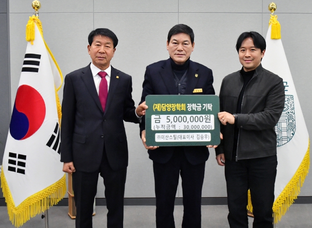 [뉴스다컴] (재)담양장학회는 지난 26일 ㈜이산스틸(대표이사 김승우)에서 5백만 원을, ㈜고서삼화자원(대표 이형수)에서 2백만 원을 기탁했다고 밝혔다.
