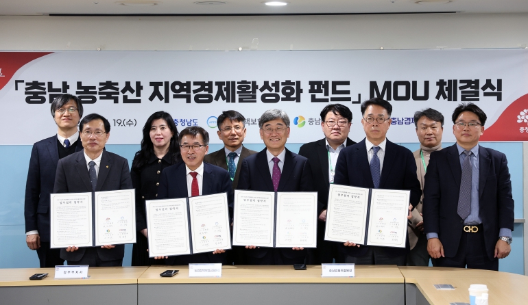 [뉴스다컴] 충남도는 19일 도청에서 농업정책보험금융원, 충남테크노파크, 충남경제진흥원과 ‘충남 농축산 지역경제 활성화 펀드’ 업무협약(MOU)을 체결했다.