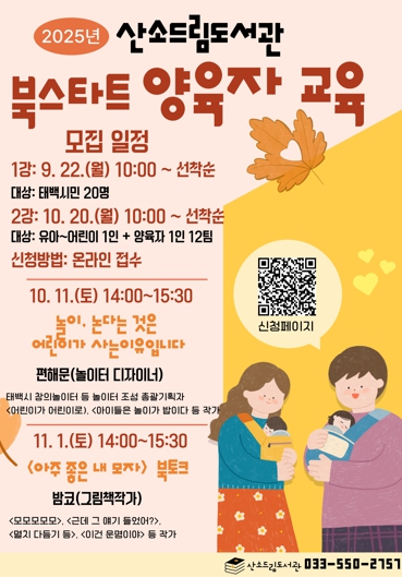 [뉴스다컴] 태백시는 산소드림도서관에서 북스타트 사업을 알리고 올바른 독서교육 방향을 제시하기 위해 “2025년 북스타트 양육자 교육”을 다음과 같이 운영한다고 밝혔다.