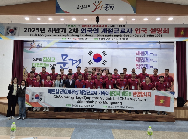 [뉴스다컴] 문경시는 10월 24일 외국인 계절근로자 28명과 관내 농업인이 참여한 가운데 농업기술센터에서 2025년 하반기 2차 외국인 계절근로자 입국설명회를 개최했다.