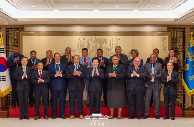 이에 이재명 대통령은 "기후위기 대응이나 개발협력에 관심을 갖고 가능한 범위에서 최대한 협조하겠다"면서 "태평양도서국들을 꼭 한번 방문하고 싶은데 어디로 갈지 잘 골라보겠다"고 웃으며 화답했다.