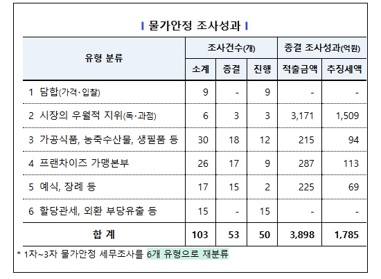 이에 국세청은 ’25.9월부터 ’26.1월까지 3차에 걸쳐, 과도한 가격 인상으로 폭리를 취하며 탈세를 일삼은 담합, 독・과점, 가공식품・생필품 제조, 농축수산물 유통 등 103개 업체에 대해 조사를 실시했으며, ’25.9.25. 착수한 1차 세무조사 결과, 53개를 종결하여 3,898억 원을 적출하고, 1,785억 원을 추징했다.