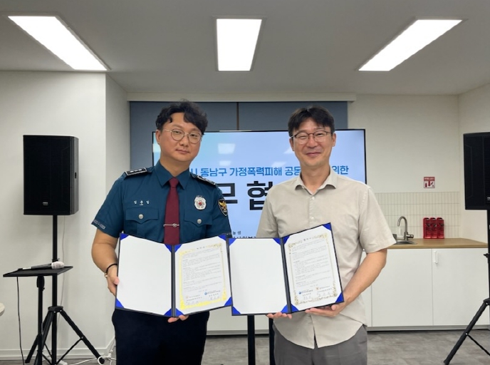 [뉴스다컴] 천안동남경찰서는, ’25년 7월 15일 14:00경, 천안시 서북구 성정동소재에서 천안시성정종합사회복지관(관장 함호영)과 여성청소년과장 등 10여명이 참석한 가운데 가정폭력 등 관계성 범죄피해자 보호를 위한 업무 협약식을 체결했다.