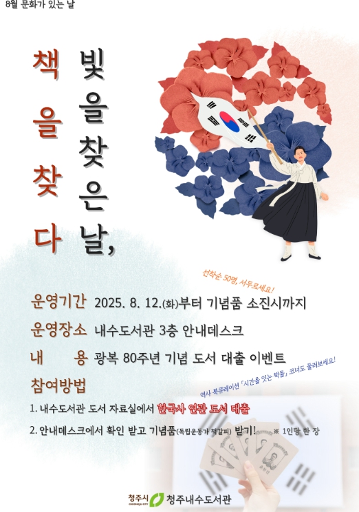[뉴스다컴] 청주내수도서관은 8월 문화가 있는 날을 맞아 광복 80주년의 의미를 되새기고 시민들이 우리 역사를 보다 가깝게 느낄 수 있도록 도서 대출 이벤트 ‘빛을 찾은 날, 책을 찾다’를 운영한다고 8일 밝혔다.